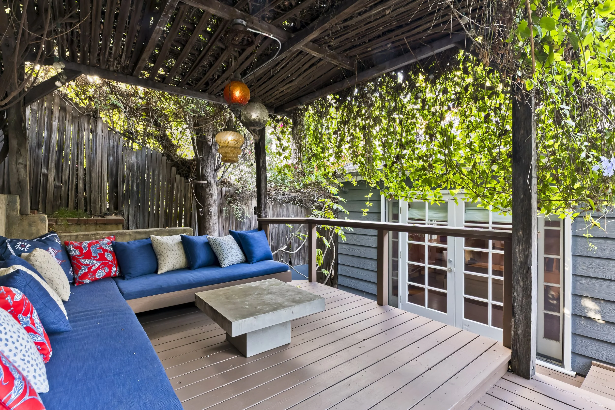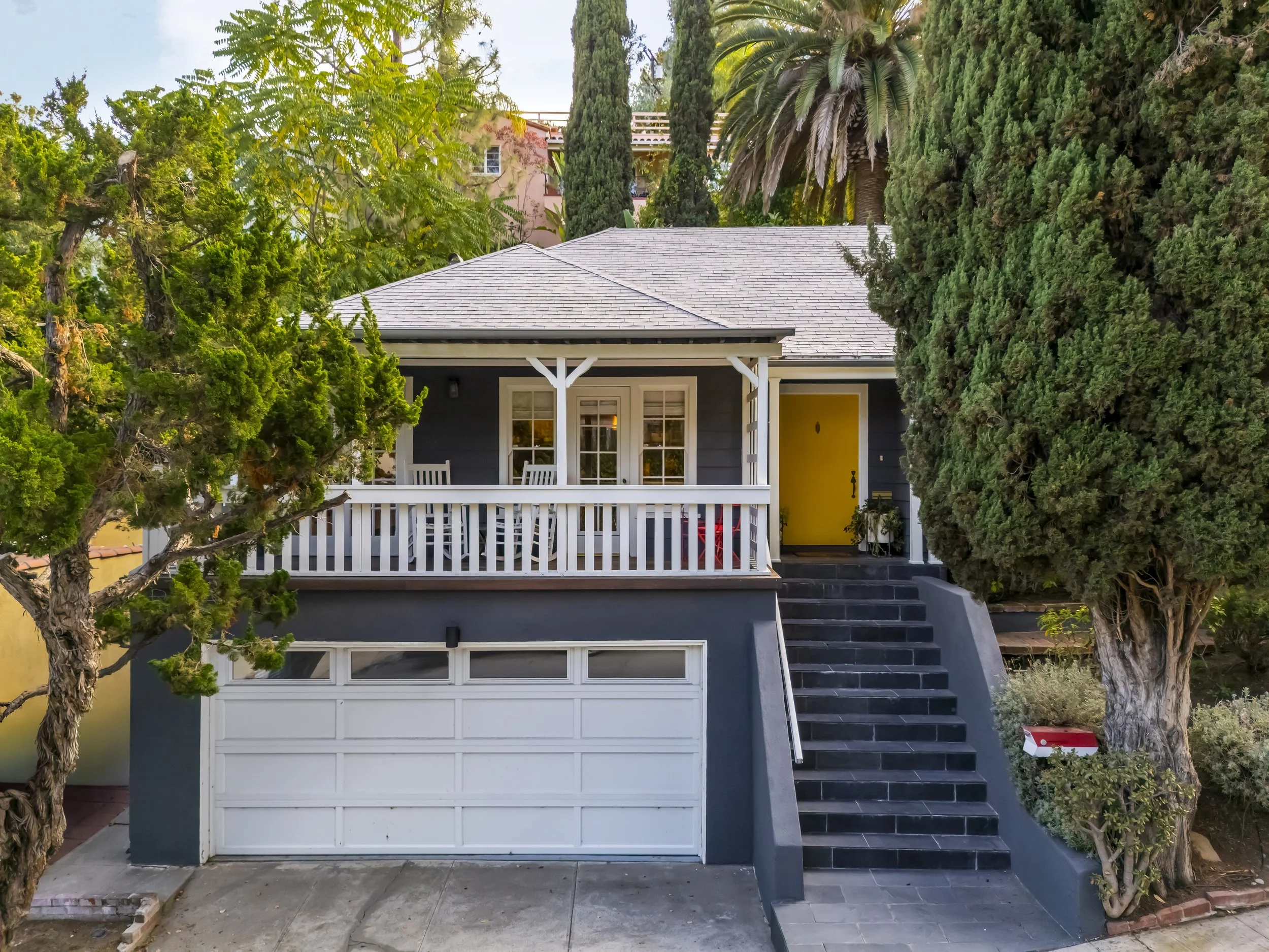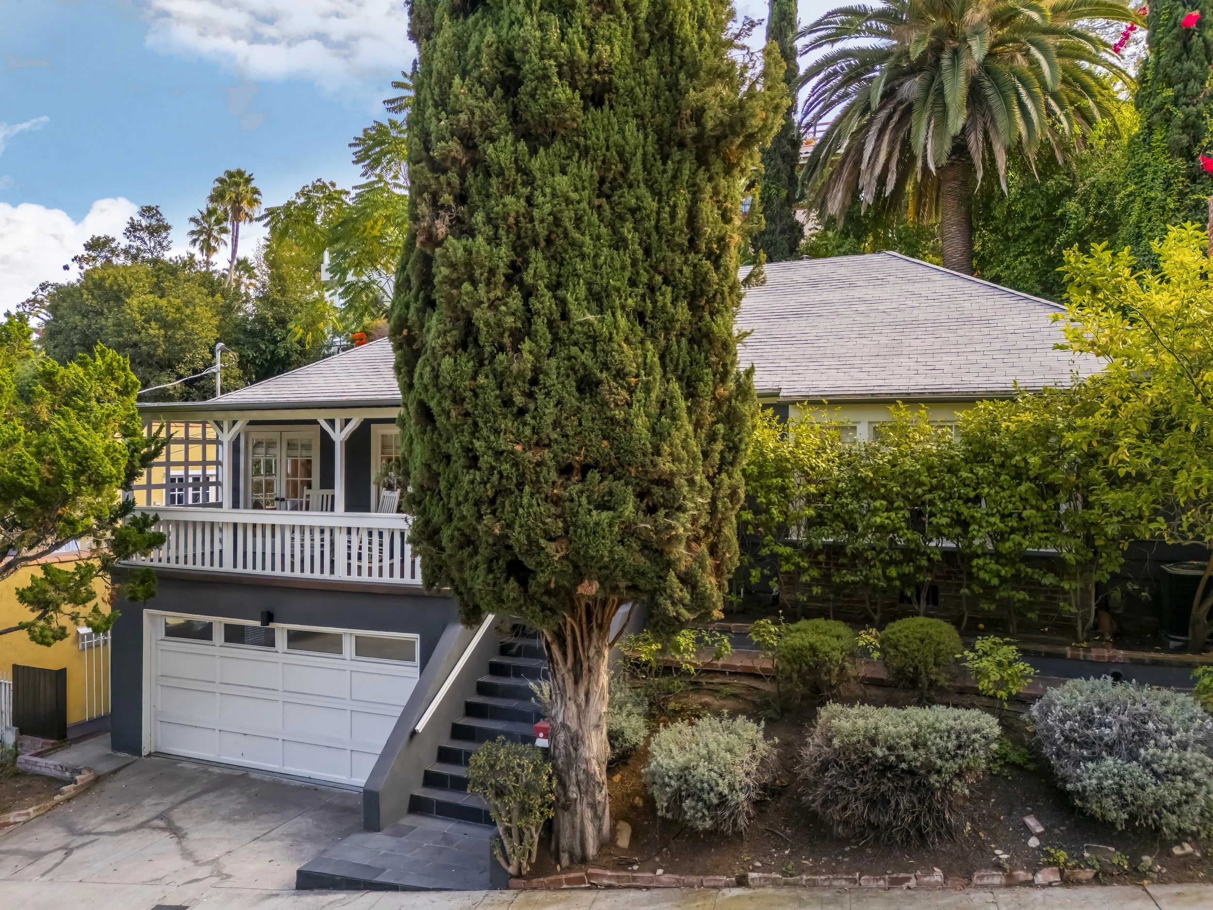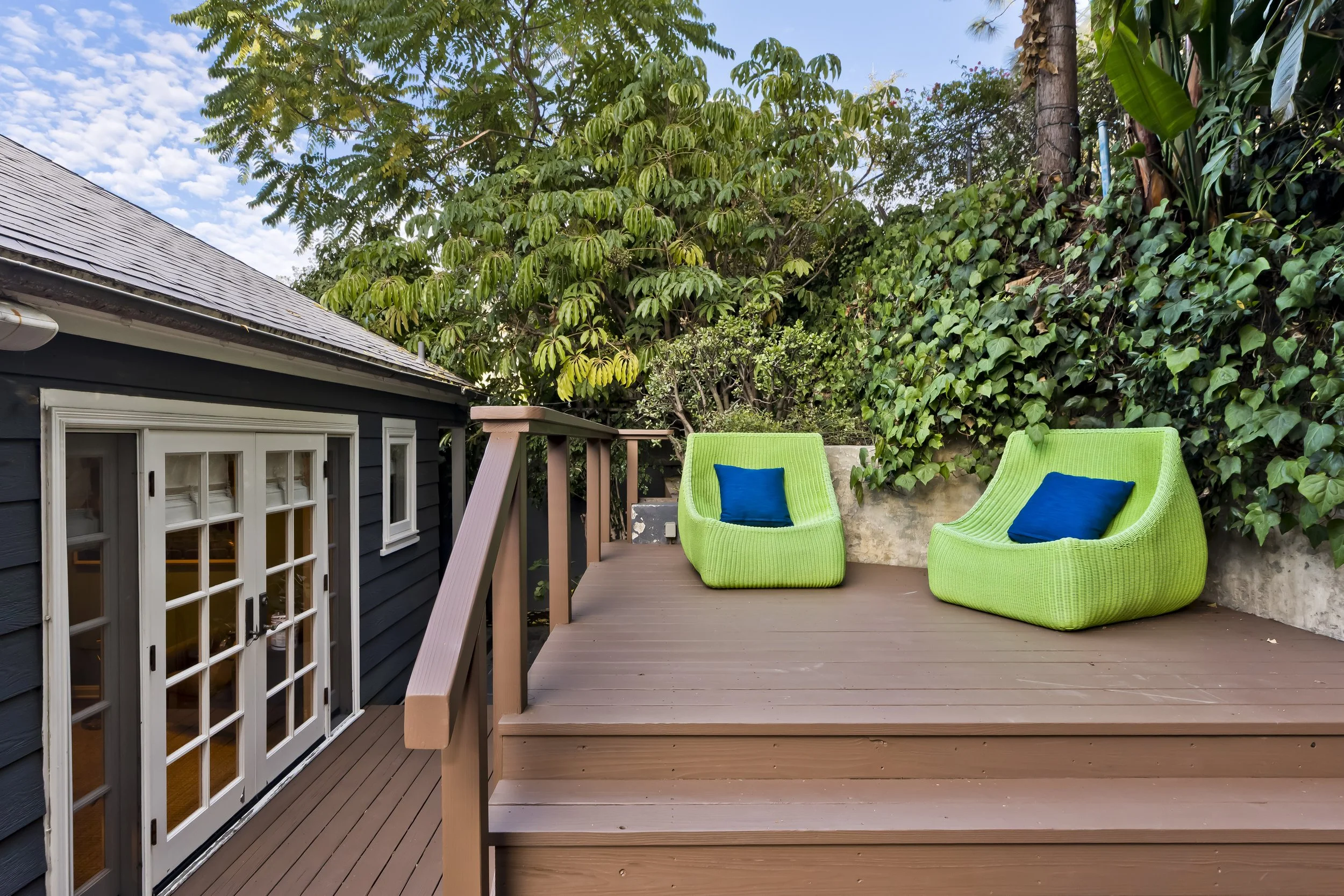 Tucked away in the most sought-after pocket of Beachwood Canyon, this gorgeous bungalow blends timeless charm with designer style. Step inside and you're welcomed by a cozy entryway that opens into a living room complete with built-in bookcases and fireplace, creating a warm inviting vibe . The open floor plan seamlessly connects the spacious kitchen and dining area, featuring plentiful storage, a stylish SMEG refrigerator, stainless steel appliances, and double French doors that open to a charming front deck perfect for morning coffee or sunset dinners. The large primary bedroom offers a peaceful retreat with a walk-in closet and double-door access to the yard, while the full hall bath features a beautiful clawfoot tub, walk-in shower, and marble-topped vanity. The second bedroom is ideal as a cozy guest room, den, or home office, and the designer powder room adds a chic touch for visitors. Hardwood floors throughout, custom window coverings for all windows and doors. A huge laundry room provides even more storage, and the attic accessible from the hall closet offers plenty of extra space. Step outside to a private backyard oasis with large leveled decks perfect for entertaining or relaxing under the stars. The garage can be used for parking, a studio or office and includes its own half bath. With a street-to-street lot and no neighbors behind you, this home offers rare privacy and a true sense of warmth in one of Los Angeles' most enchanting neighborhoods.