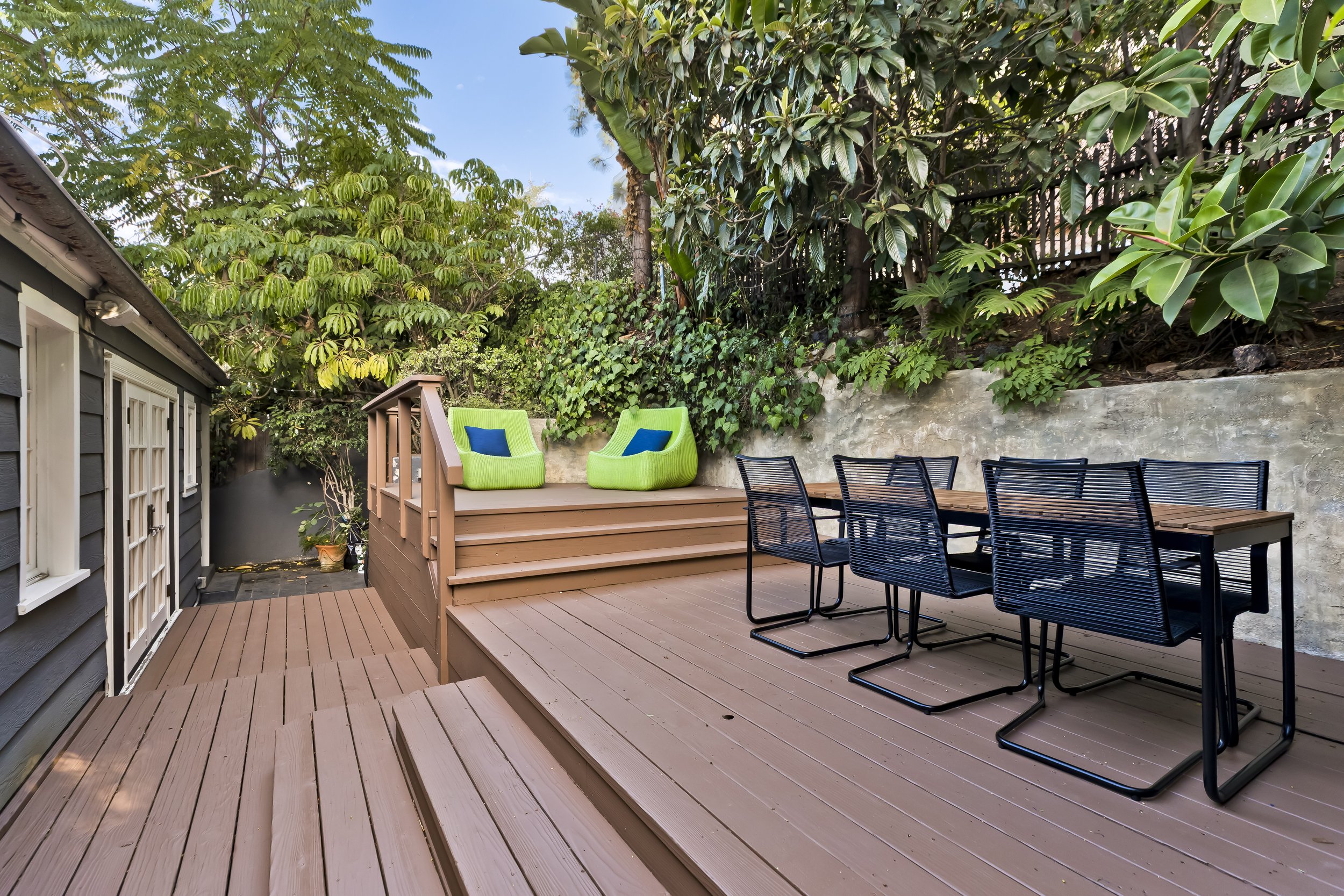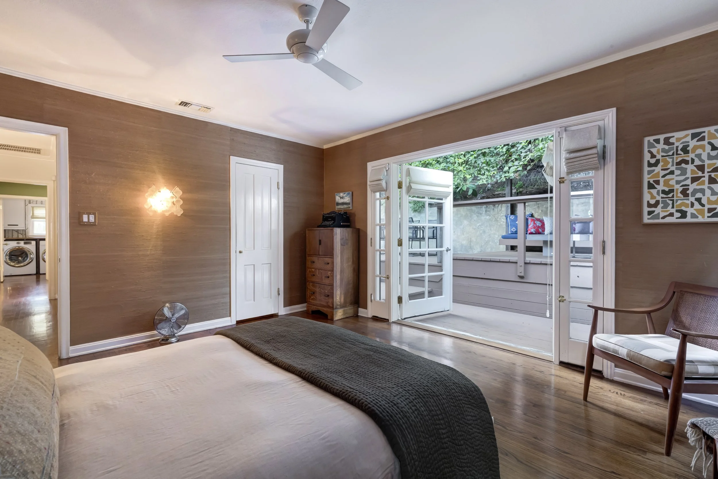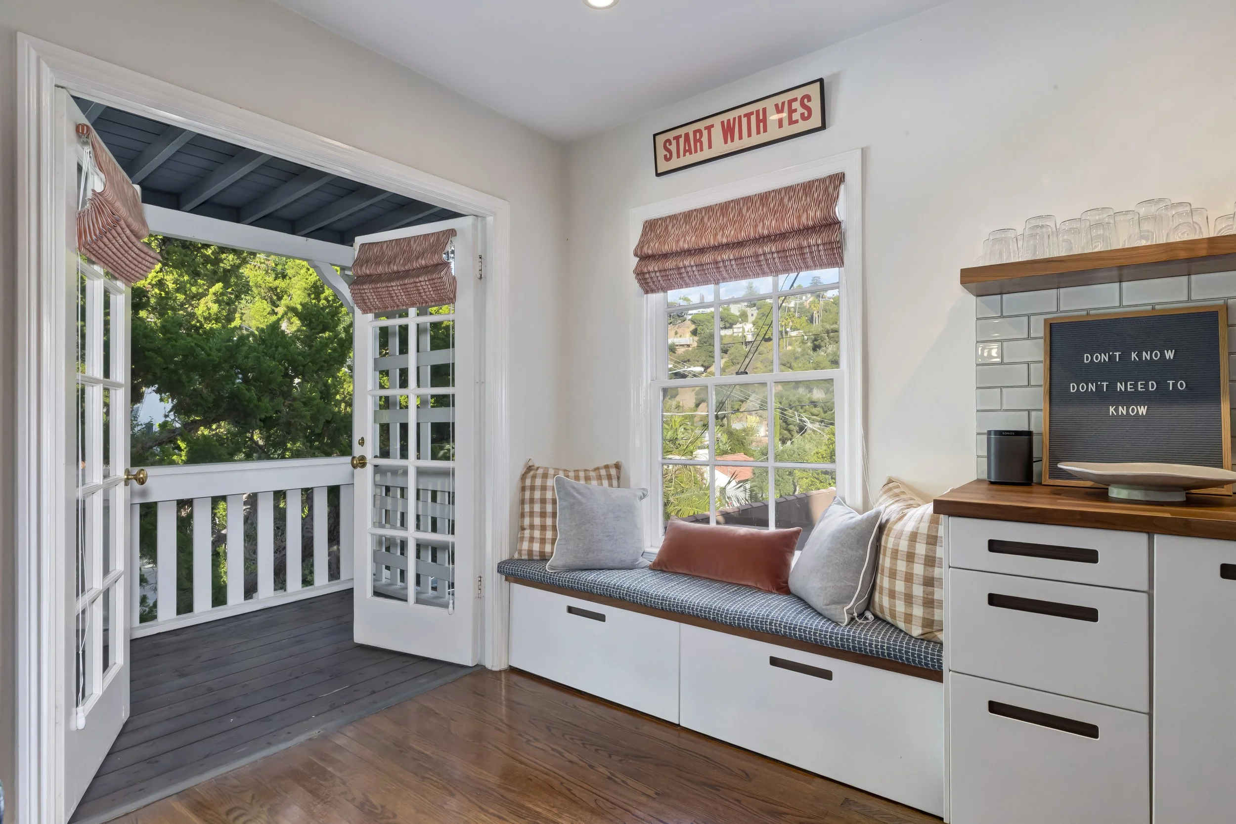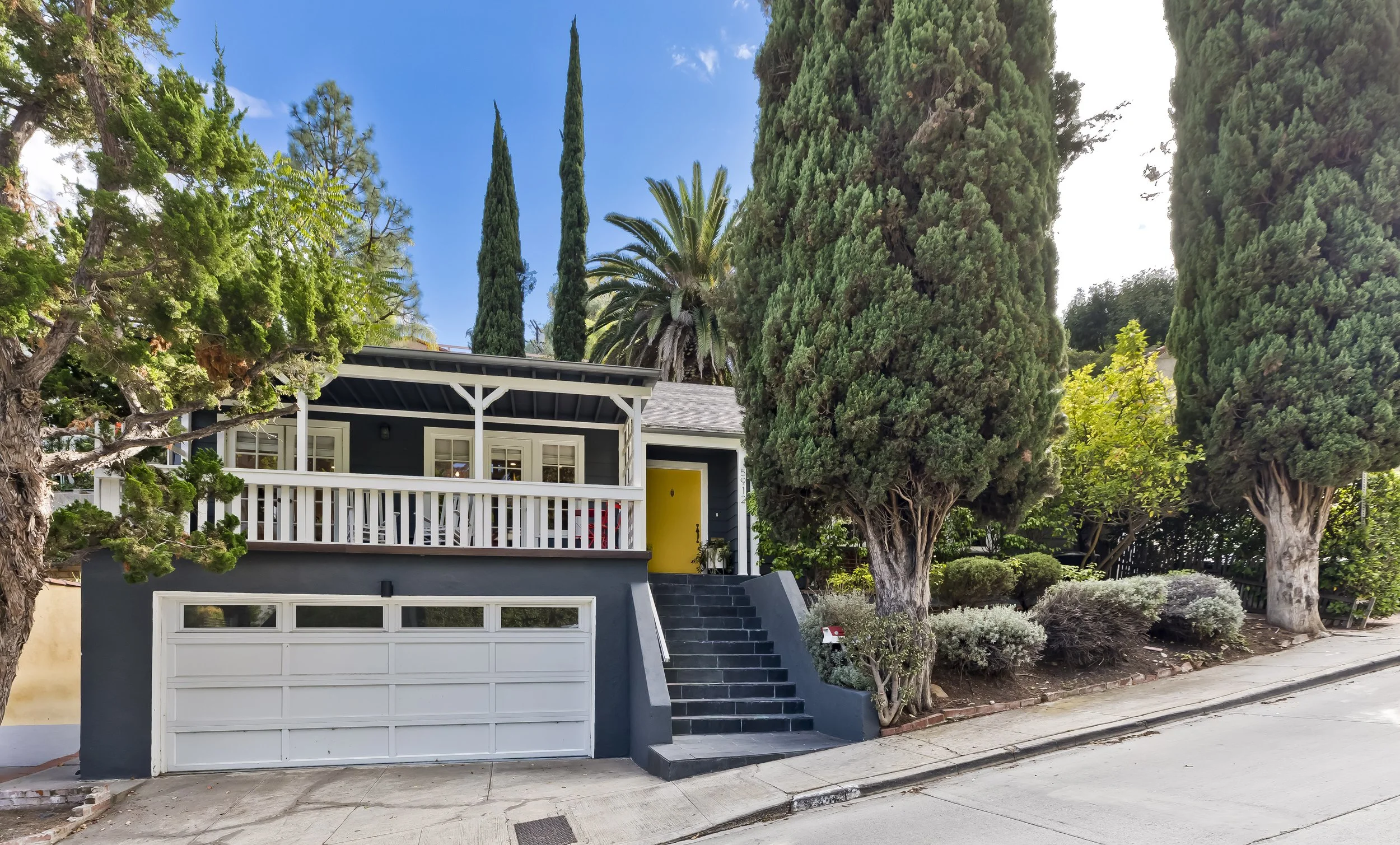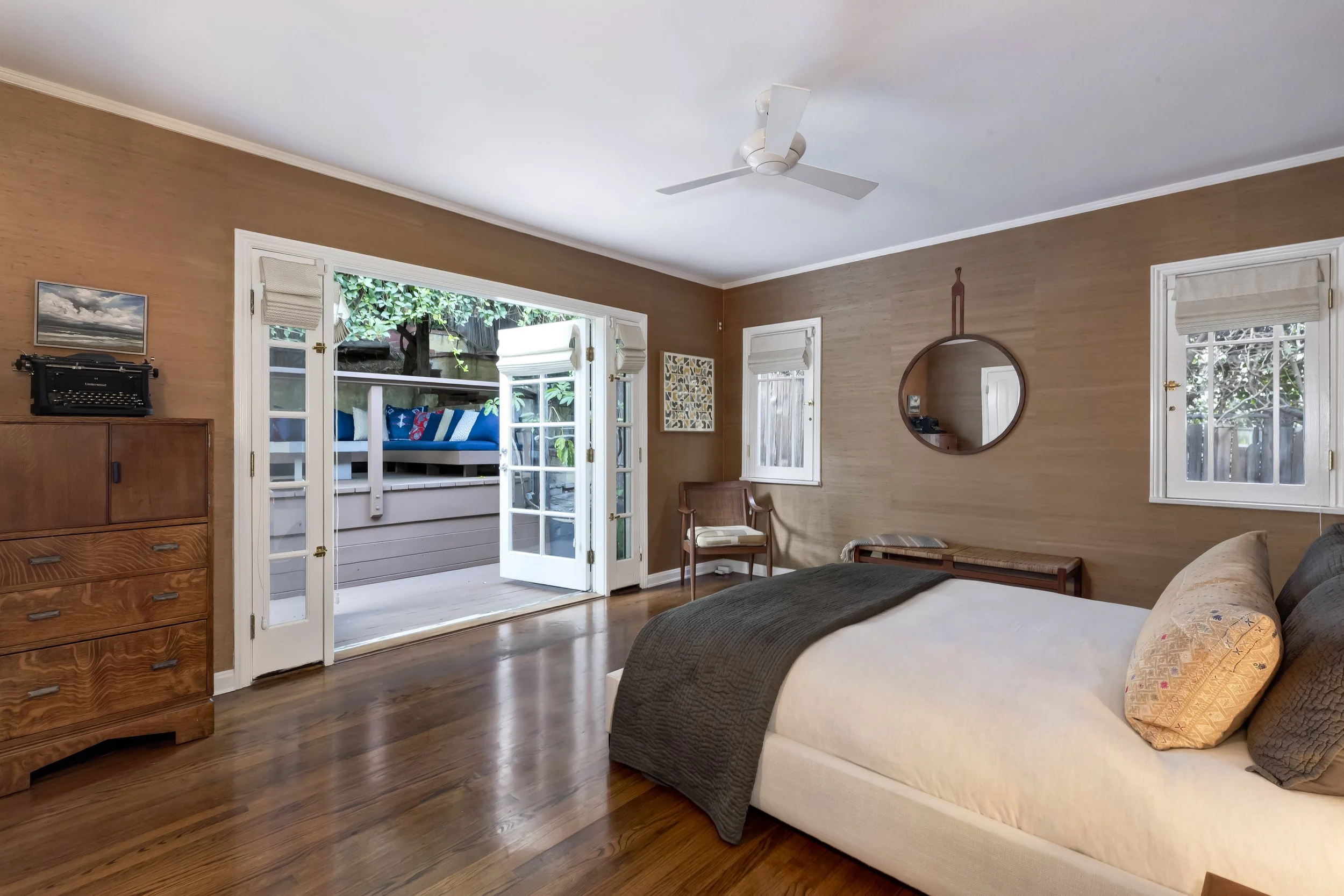 Tucked away in the most sought-after pocket of Beachwood Canyon, this gorgeous bungalow blends timeless charm with designer style. Step inside and you're welcomed by a cozy entryway that opens into a living room complete with built-in bookcases and fireplace, creating a warm inviting vibe . The open floor plan seamlessly connects the spacious kitchen and dining area, featuring plentiful storage, a stylish SMEG refrigerator, stainless steel appliances, and double French doors that open to a charming front deck perfect for morning coffee or sunset dinners. The large primary bedroom offers a peaceful retreat with a walk-in closet and double-door access to the yard, while the full hall bath features a beautiful clawfoot tub, walk-in shower, and marble-topped vanity. The second bedroom is ideal as a cozy guest room, den, or home office, and the designer powder room adds a chic touch for visitors. Hardwood floors throughout, custom window coverings for all windows and doors. A huge laundry room provides even more storage, and the attic accessible from the hall closet offers plenty of extra space. Step outside to a private backyard oasis with large leveled decks perfect for entertaining or relaxing under the stars. The garage can be used for parking, a studio or office and includes its own half bath. With a street-to-street lot and no neighbors behind you, this home offers rare privacy and a true sense of warmth in one of Los Angeles' most enchanting neighborhoods.